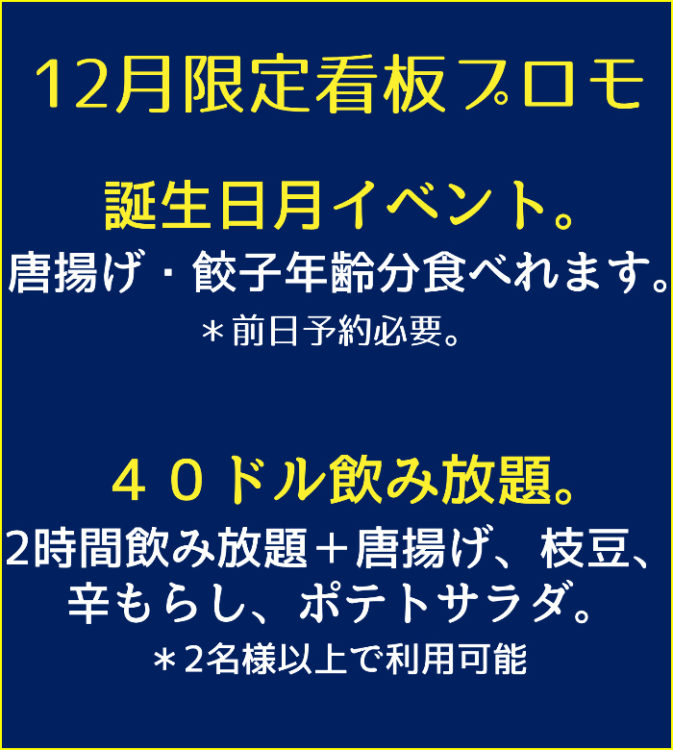 *1グループで複数のお誕生日月の方がいらっしゃる場合は1名様のみ餃子に変更可能。