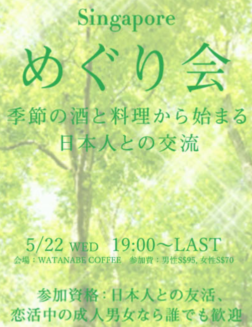 シンガポールで日本人向け交流会「めぐり会」を開催いたします。 当日は、「桜」をテーマに、ワインやお茶、和食や和菓子などをご提供!日本特有の四季のお酒やお料理をきっかけに、楽しく交流していただけます。 シンガポールで日本人との交流や出会いをご希望の方は、ぜひお気軽にご参加ください。 https://singapore-megurukai20190424.com/