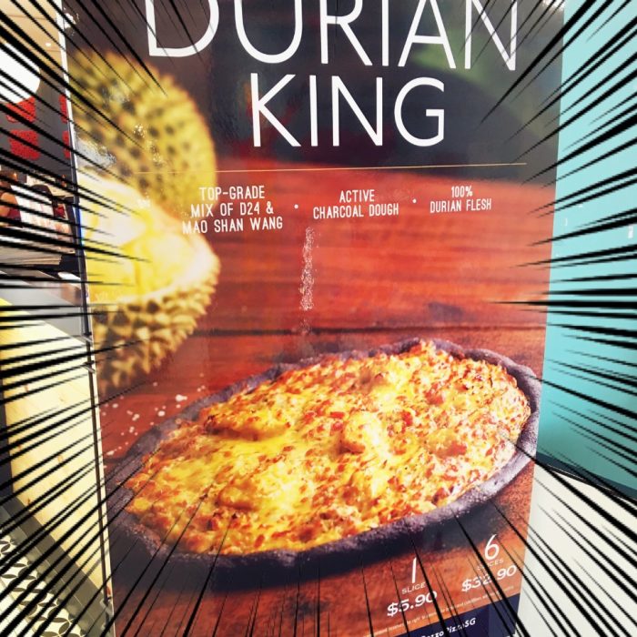 ん?なんか黄色いピザがあるぞ?っと思ってみたら、、、これドリアンピザだw 以前ドリアンピザを記事にしたけど、やっぱりシンガポールに来たなら自分で食べてみないとね!!(謎) このお店の期間限定のドリアン・ピザの名前がイカツイw「DORIAN KING」
